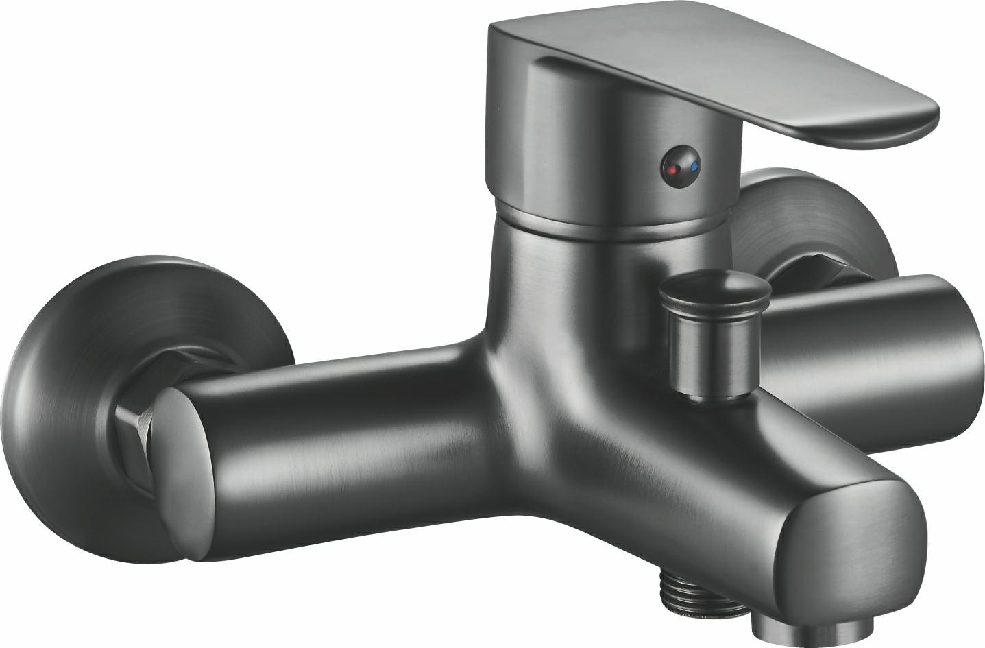 This is a Gunmetal gray bathtub faucet produced by Haogeer in China, installed on the bathroom wall, which can adjust water temperature flow rate. The main body is a horizontal tubular structure, and the surface is a wear-resistant and corrosion-resistant gunmetal gray coating, which is compatible with modern bathroom.